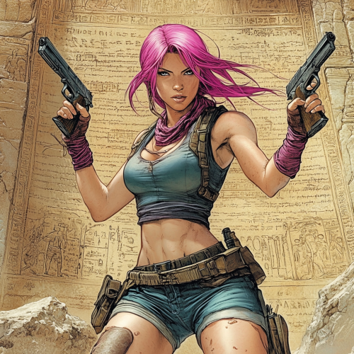 graphic novel panel with Professor Alice Roberts as Lara Croft, pink hair, vest, shorts, holding two pistols in an action pose, against a background of ancient writing on a scroll