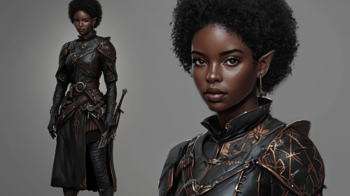A black halfling rogue named Lara the Cunning, with a lithe and agile build. African, warm, dark complexion and expressive, mischievous eyes that gleam with intelligence. Her hair is afro and dark, styled into a short, practical cut. She wears a sleek, dark leather outfit adorned with subtle, intricate patterns, perfect for stealth and agility. Her outfit includes a belt with various hidden pockets and a dagger strapped to her thigh. Lara’s expression is sly and confident, style of octane render, --ar 16:9
