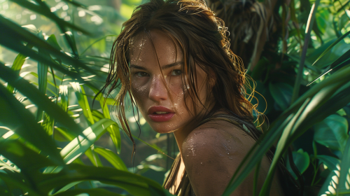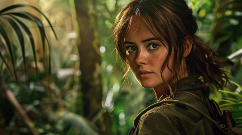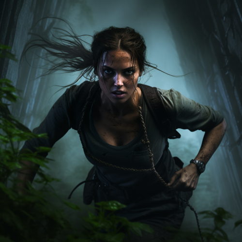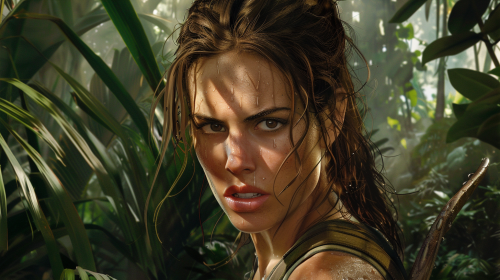Hayley Atwell as Lara Croft in a jungle. Photorealistic, 4k, --ar 16:9