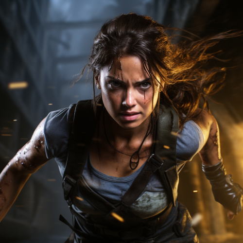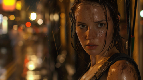 Daisy Ridley as Lara Croft in london at night. Photorealistic, 4k, --ar 16:9