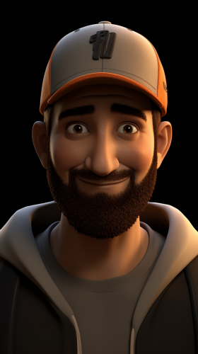 A 35 year old male, black baseball cap, medium beard, small eyes, small mouth, round face, neutral expression, disney pixar 3D style. --ar 9:16