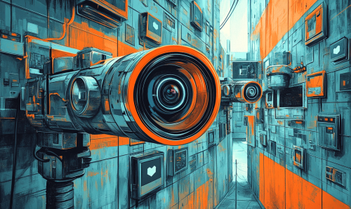 In the style of John Singer Sargent and Craig Mullins, an artistic drawn illustration on cybersecurity features on YouTube content creating, cameras, content creating, cybersecurity, in anime style, sunny colors, --aspect 5:3 --stylize 200 --no people