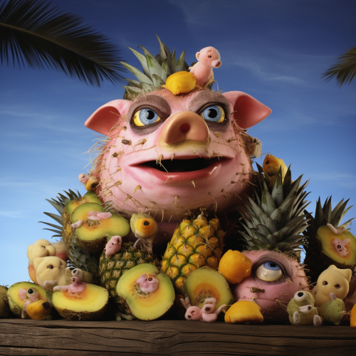 cursed photograph of a pile of skin with eyes, pig, pineapple, flies, palm tree