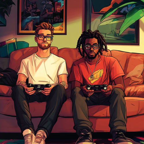 Cartoon Network poster, Super tall skinny white dude with glasses playing video games on a couch sitting next to, black dude with dreads wearing glasses