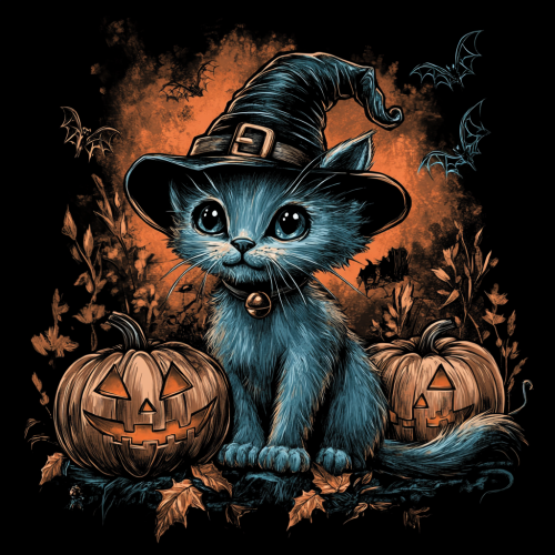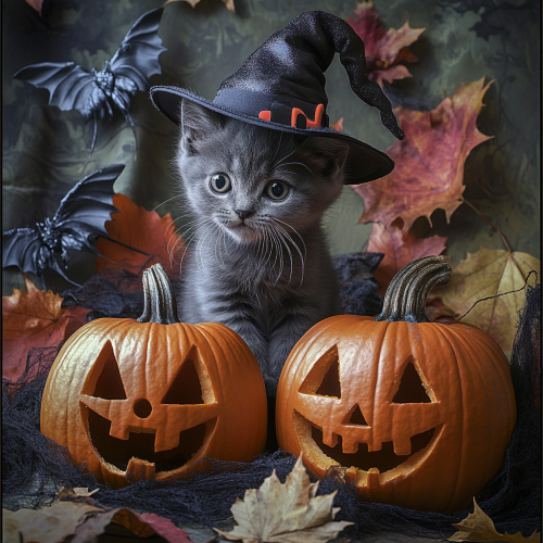 A gray kitten wearing a black witch's hat AND LOOKING AND SMILING AS The Cheshire Cat FROM ALICE ADVENTURES IN WANDERLAND STORY, sitting next to two carved pumpkins on a spooky Halloween background with bats kitten wearing a black witch's hat, sitting next to two carved pumpkins on a spooky Halloween background with bats, AUTUMN LEAVES, CANDELS, SPIDER WEB