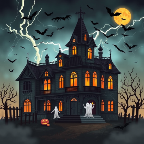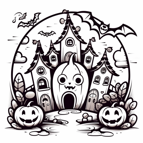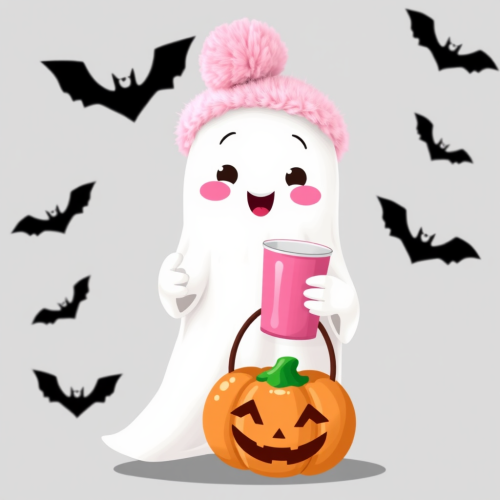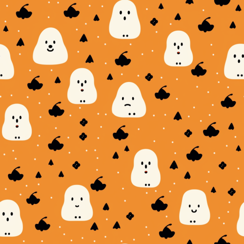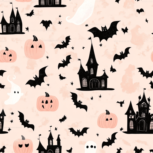 design and create seamless repeat pattern halloween inspired with pastel pinky theme, black bats, pumpkin, horror castle, flying chubby ghost, seamless repeat pattern, --tile