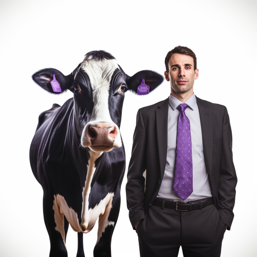 a man in a business suite with purple tie and holstein cow head. Standing with a farmer , posing happily in front of white background
