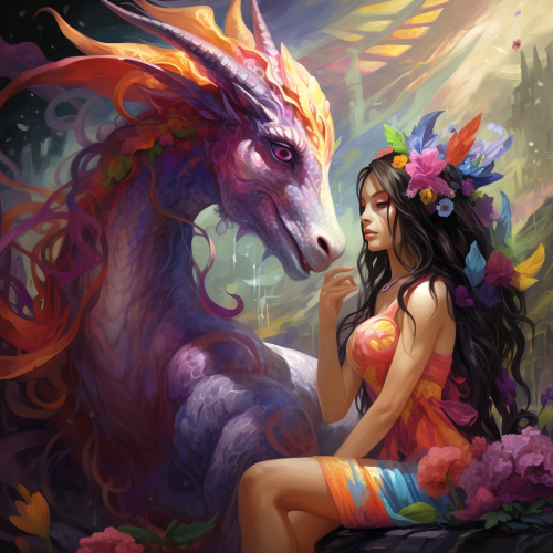 fantasy setting, a rainbow scaled dragon woman tends to a large bright purple rabbit that’s the size of a small cow