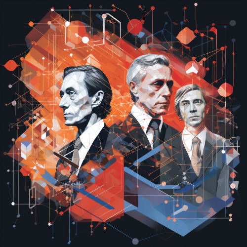 Design an image that tells the story of the evolution of cognitive systems, intertwining the legacies of Blaise Pascal, Claude Shannon, and Olivier Houdé. Start with a backdrop of a brain, divided into two contrasting sections representing Pascal's concepts of 'geometry' and 'finesse'. Overlay portraits of Blaise Pascal and Claude Shannon, each associated with the respective sections of the brain they influenced. As the image progresses, introduce a third, harmoniously integrated segment symbolizing Olivier Houdé's 'inhibiting system'. This segment should appear as a protective or regulating layer, emphasizing its role in moderating the other two systems. Use visual elements like overlays, gradients, or pulsing effects to suggest the dynamic interaction between these systems. The overall mood should convey a journey of discovery, with a color palette that combines the historical with the modern, reflecting both past insights and current understanding.