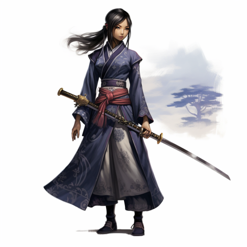 "Visualize a cena of a 17-year-old female samurai shugenja from the Dragon Clan in the Legends of the Five Rings RPG, embarking on a significant moment in her journey. Picture her as an agile and slender figure, standing at a height of 1.63 meters, wielding a wakizashi with grace. Cloaked in the distinctive colors of the Dragon Clan--yellow and green--her attire is a seamless blend of traditional Japanese design and the unique aesthetic of her clan. Capture this moment in the style of a Japanese woodblock print, where the strokes and nuances of the medium convey the atmosphere of feudal Japan. The shugenja's expression reflects both determination and serenity as she navigates through her journey. The background, composed with meticulous details, includes cherry blossoms, ancient architecture, and elements that symbolize the mystical journey she undertakes. This composition should encapsulate the character's agility, the significance of the wakizashi in her hands, and the spirit of the Dragon Clan as portrayed through her attire and surroundings--a harmonious blend of the fantastical and the historical in the world of Legends of the Five Rings."