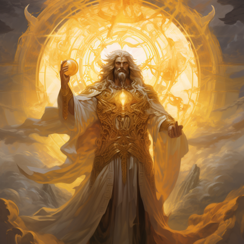 the god of sun and light, a figure clad in golden robes, radiating an aura of warmth and brilliance. His eyes sparkle like sunlit waters, and his presence exudes an infectious vitality and a sense of benevolence. Around him, the very air seems to shimmer with a golden glow.