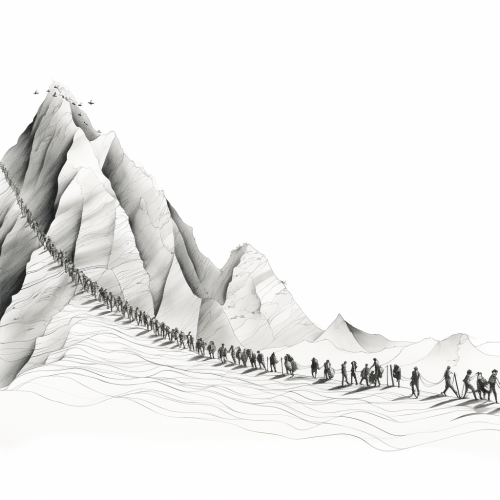 a large line of men, children and women traveling on foot with rags and tired faces for the high mountains drawn with horizontal steep lines inside the body of the mountains in rupi kaur style in black and white with pencil
