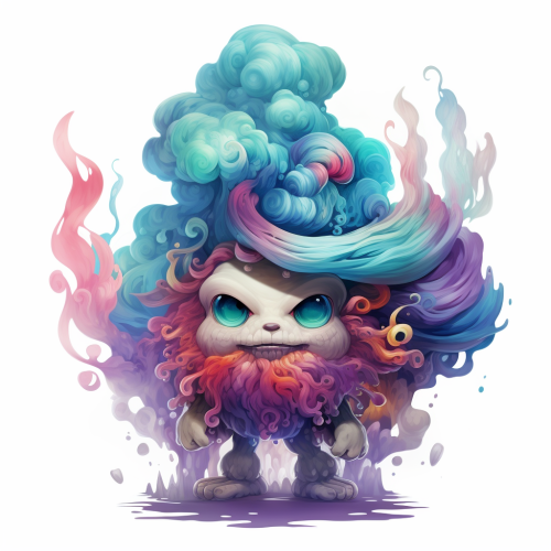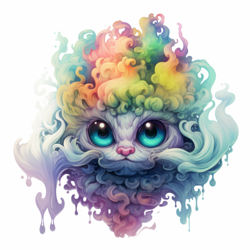 Gaseous smoky humanoid creature made out of clouds, vivid psychedelic colors, cute and terrifying, D&D character, portrait, 3/4 angle, white background --style raw