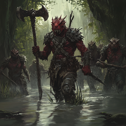 dnd art. tall humanoid group with a red skin standing in the middle of the swamp. they wear heavy armor. one humanoid looking like a lizard jump out from the water. He holds an axe in his hands. grim atmoosphere