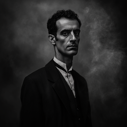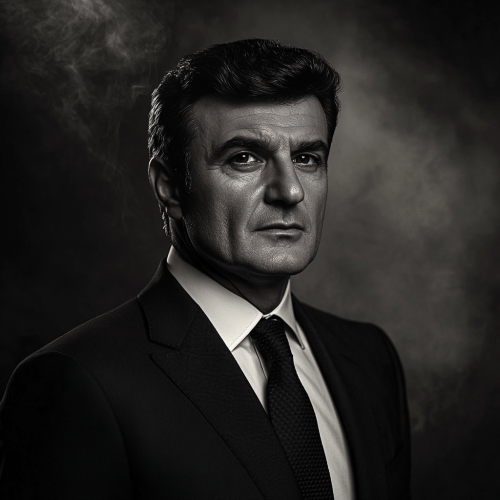 a Romanian man in his forties, handsome, tall and thin, with a rapacious face, hard features marked by life, black hair and light eyes, dressed in a tailor-made suit; black and white; smoky background, --ar 1:1