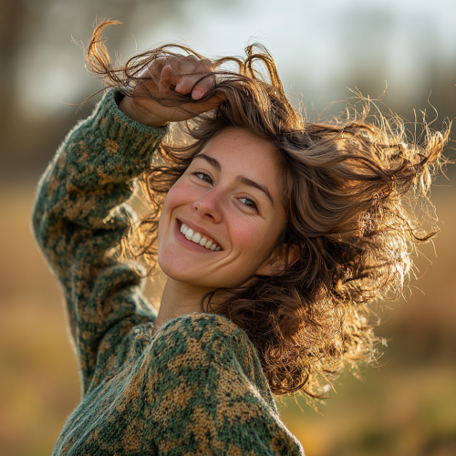 A candid outdoor portrait shot taken with a Sony Alpha A7, featuring a romanian woman with natural, imperfect beauty and vibrant, healthy curly hair. The dynamic angle captures her smiling energetically, one hand playfully running through her hair. She is dressed in a casual, long-sleeved outfit, avoiding a summer vibe. The natural light enhances her authentic, relatable appearance, while the soft, nature-inspired turquoise background blends seamlessly with the outdoor setting. The shot feels lively, real, and perfect for a hair product campaign that emphasizes genuine beauty. Photorealistic, commercial photography style.