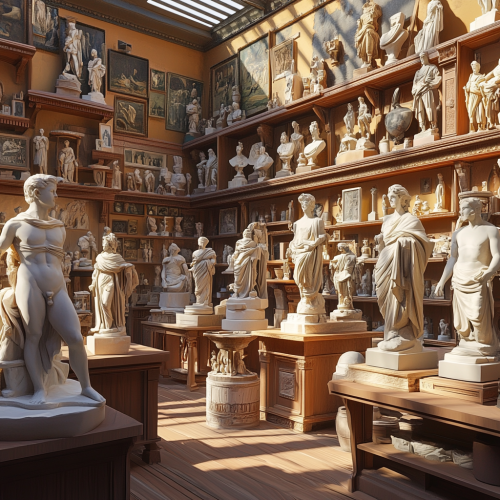 A Pixar-style animated of an ancient Roman marble statue workshop, with many different classical Roman sculptures, Renaissance-style statues, and plinths on shelves and in the room.