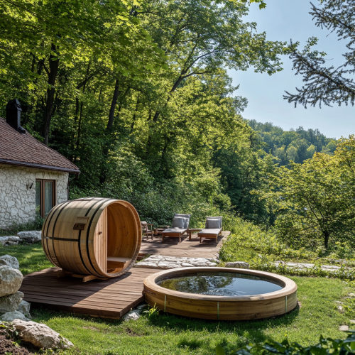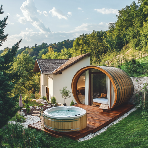 Architectural photography, a Romanian traditional cottage village house with a wooden barrel jacuzzi in a modern back yard with wooden deck, between lush greenery, next to a forest, on a hill