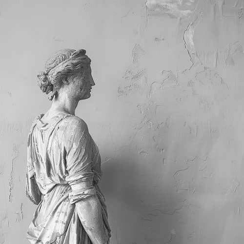advertising photo. antique statue with stains. whole figure on monochrome white background. irregularities. friability. advertising photo Camera settings: Sony fx3, 85mm, natural light in the background --ar 1:1 --s 750 --v 6.0