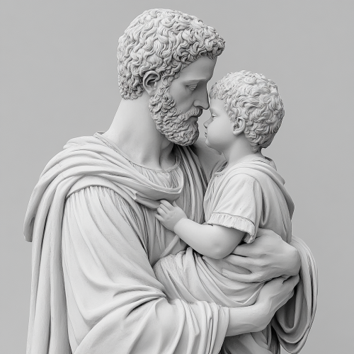 light gray background Overall black and white There is a Roman man holding a child The man is kissing the child on the head lateral view image of a plaster statue realistic high quality
