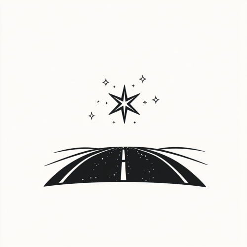 very simple straight line symbol logo of road, twinkle symbol above road, minimal line ventor, vintage retro, white background, no text no shading detail