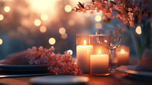 A cozy romantic setting with soft candlelight, a warm glow, and subtle floral decorations, perfect for a love story. Soft, warm colors with blurred background elements, such as a table set for two or a dreamy evening sky, photorealistic, --ar 16:9