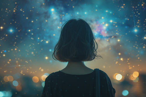 The back of an asian woman with short hair under a beautiful night sky filled with stars. Back view. Ghibli style. --ar 3:2 --v 6.0 --stylize 750