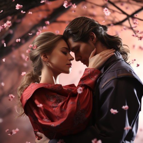 movie scene concept, japanese love series lead actors, love couple under the cherry blossom tree in the wind, dynamic, 3D, hyperrealistic, ultradetailed, bright colors, smooth textures, shiny traditional clothes --style raw --s 750