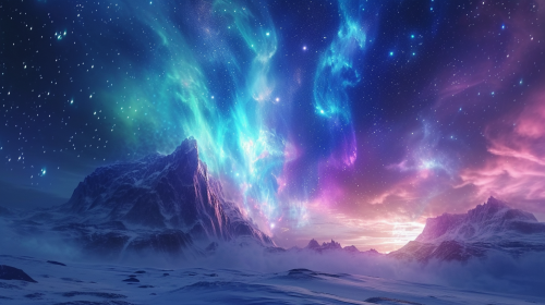a breathtaking dimension under a sky filled with auroras, capturing the essence of a final declaration of love. Visualize the landscape as it shifts with emotions, where a sapphire light and the aura merge in a dazzling display of colors. This unity symbolizes the transformative power of love, encompassing the sun, the stars, and a newfound life. Emphasize the profound connection and the culmination of their journey under the celestial glow --ar 16:9 --v 6.0