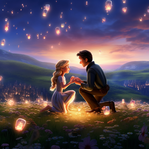 Imagine a heartwarming Disney-Pixar scene where a charming and magical proposal unfolds. The setting is filled with enchantment and emotion. In this animated world, a character, deeply in love, gets down on one knee to propose to their beloved. The backdrop could be a beautifully rendered and dreamlike environment, such as a sunlit meadow or a starry night under a glowing lantern-lit sky. The characters, with expressive features and endearing personalities, are beautifully animated and convey the depths of their love. The proposal is executed with great tenderness, and the emotions are palpable, tugging at the heartstrings of the audience. This enchanting Disney-Pixar moment captures the universal theme of love and commitment, delivering a message of hope and celebration of a new chapter in life. It invites viewers of all ages to believe in the magic of love and the power of heartfelt connections, as only Disney-Pixar can portray