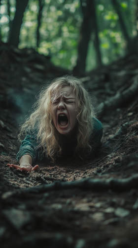 A girl falls to the ground deep in the forest, weeping and wailing. The girl is a 20-year-old Russian with blonde, permed hair. The girl is tormented by grief and fear and weeps with anguish. The girl is calling and asking for help. This image is focused on the girl's face as if it were a photograph taken with a single-lens reflex camera. The background is deep in a dark, deep, eerie forest. A gloomy, eerie atmosphere. A photographic representation of reality. --no illustration, painting, --style raw --ar 9:16 --v 6.1