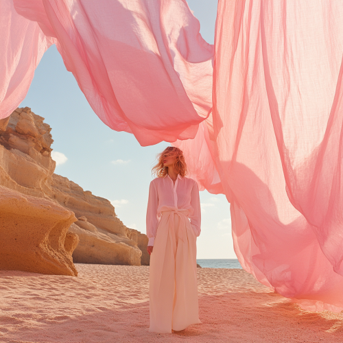 full length image, pink tones, beach popup givenchy, fabric light in the wind which gives a dreamy and romantic atmosphere, minimalist style, hyper-realistic, shot by jamie hawkesworth, beach location by David burdeny --s 250