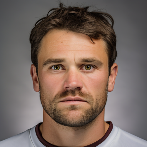 very detailed headshot from neck up fitting all of head and hair in frame wearing a Ice Hockey Jersey, american Male Ice Hockey player aged 29, He has buzzcut hair. His face is round-shaped and he has a slim look. His eyes are tired, with slanted eyebrows that give him a happy and fun expression. He has a predominant nose and smiling lips and pimples.