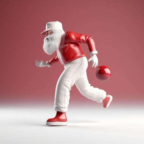 stylized christmas santa plays bowling, white beard, red jacket, red pants, dynamic pose, full body, cinematic light, christmas vibes, 3d plastic style --v 5.0 --s 50