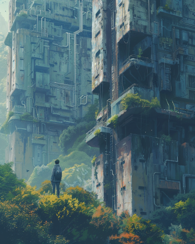 solitary and lonely sci fi landscape, the mood is free and airy but at the same time is lonely and sad, nature taking over on abandoned buildings, sci fi landscape, in the style of Simon Stålenhag, wu guanzhong, jessica rossier, industrial, brutalist, strange, playing with light and shadow, brushstrokes visible, richard wright --ar 4:5 --v 6.0