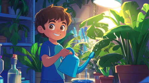 A bright, colorful cartoon-style illustration of an 11-year-old boy named Awess in a laboratory at night, watering tropical plants with a watering can. Awess has brown hair, brown eyes, fair skin, and is smiling warmly as he carefully waters the plants. The laboratory has a mix of scientific equipment and tropical plants with large, lush leaves, creating a unique blend of nature and science. Soft moonlight filters in through a window, casting a gentle glow, and a few warm lights illuminate the scene to highlight the plants. The atmosphere is calm, educational, and engaging, designed to show the importance of watering plants at the right time to save water. --ar 16:9