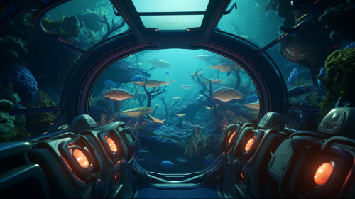fish-eye gameplay shot of a VR 3D first-person time-travel game set in futuristic deep sea base, unreal engine 5, photorealistic, colorful, sci-fi accurate, high fidelity graphics, 25mm lens, POV, --ar 16:9 --v 5.2