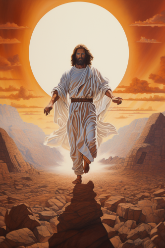 1970s dark fantasy sci fi poster drawing of Jesus Christ stepping out of a time machine in the desert in the style of artist Michael Whelan --ar 6:9
