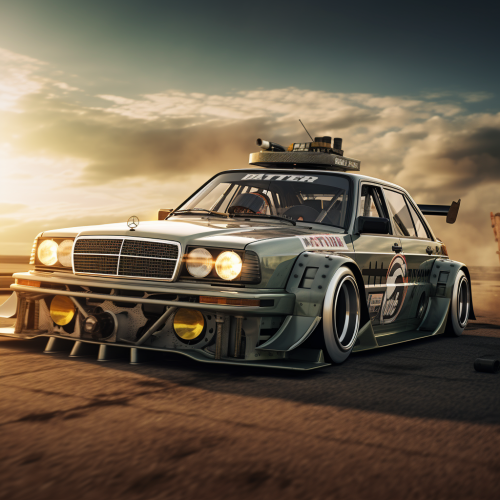 a dtm mercedes 190e turned flying with the 4 wheels as jet thrusters after having turned into a time machine similar to the Delorian from the back to the future movies. It should have hoses and other elements on it that makes it feel like a futuristic time machine.