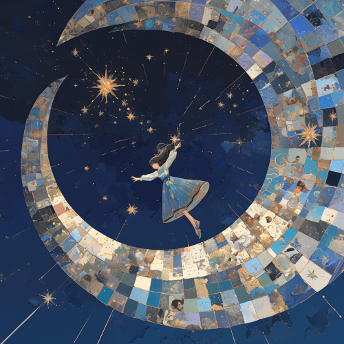 An 18-year-old girl floats gracefully through a sky made entirely of stained glass, where each star is a delicately crafted piece of glass art that shimmers with every movement. The night sky around her is a mosaic of colors, with each panel of glass depicting a different celestial scene. As she glides through the air, the glass stars cast a radiant light that dances across her skin. The girl’s expression is one of pure joy and freedom as she explores this magical, glassy world. The entire scene is surreal, dreamlike, and filled with a sense of ethereal beauty and wonder, drawn with pane --stylize 1000 --niji 6