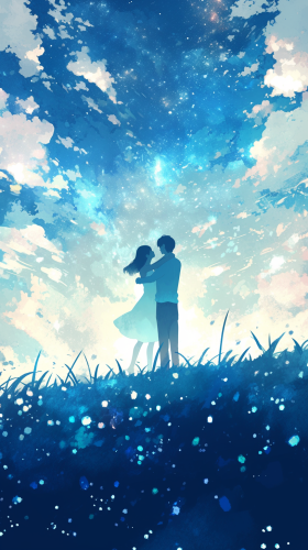 A picture using a watercolor style. Light color. A couple standing on a grassy hill, their arms wrapped around each other. The horizon is filled with light as they dance under the stars, reflecting their love and dreams. --ar 9:16 --niji 6