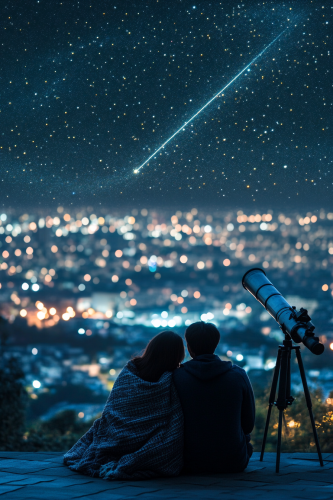 realistic image, A couple sitting on a rooftop under a starlit sky, wrapped in a blanket together. Below them, city lights twinkle, but their focus is entirely on each other as they share a quiet moment. A telescope is nearby, and the stars above are bright and clear, with a comet passing through the night sky --v 6.1 --ar 2:3
