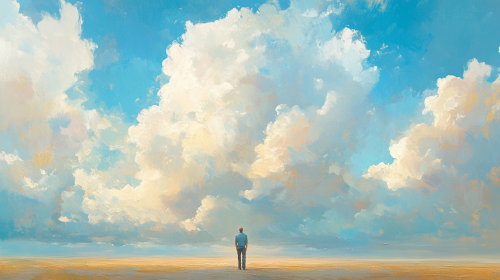 A serene image of a father with a hopeful expression, standing under a vast sky filled with Monet-style fluffy clouds. The clouds are painted with soft blues, whites, and hints of pink, capturing a gentle, dreamlike atmosphere. The father is depicted with soft, flowing brushstrokes, conveying a sense of calm and optimism. The background features a rolling landscape, adding depth and tranquility to the scene. Created using impressionistic techniques, with a focus on light play and color blending, hd quality, natural look --ar 16:9 --s 250