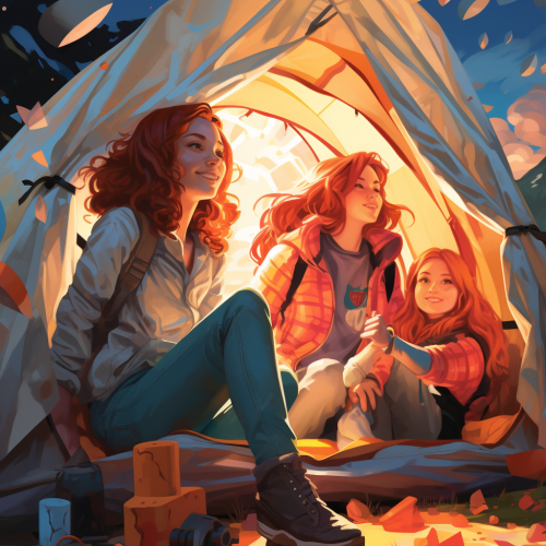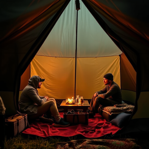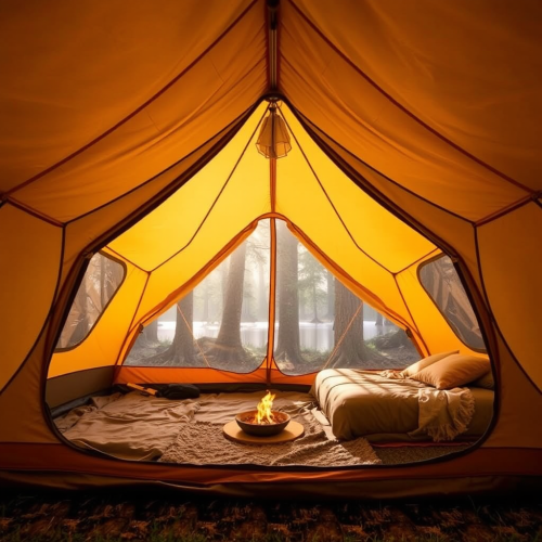 A nighttime camping scene featuring a carbon electric mat inside a small, cozy tent; surrounded by nature, a campfire nearby under a clear starlit sky; the mat emanates gentle warmth, emphasizing comfort and portability