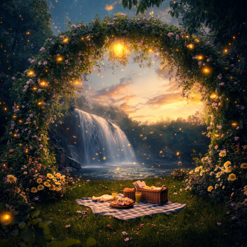 Idyllic evening landscape, a river with a waterfall in the background, well-kept nature with a large flower arch, fireflies flying around on the bank, mystical flare, picnic basket and blanket under the flower arch, starlight and polarlight in the sky