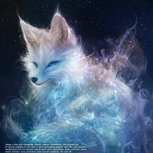 "Create a fox with dreamlike, ethereal qualities. Its fur should appear semi-transparent, blending seamlessly into the surrounding night sky, as if it were a part of the starlit heavens. The colors are soft and muted--pale blues, silvers, and hints of lavender--evoking a serene and otherworldly presence. The fox’s form is fluid and delicate, like mist, with large ears and a flowing tail that seem to fade at the edges. This fox should appear as if it moves effortlessly between reality and dreams, embodying the mystery of night."