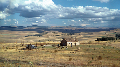 Remote rural scene near Argentina on February 27, 1959, during a period of political and economic challenges. The foreground shows a small, rustic farm with gauchos tending cattle, set against the vast pampas landscape. In the background, distant hills are visible under a partly cloudy sky, reflecting the quiet, day-to-day life in this remote area. The lighting is soft, capturing the serene and undisturbed nature of rural Argentina. --ar 16:9 --v 6.0 --style raw
