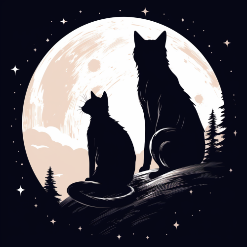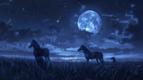 2 horses are surrounded by hound dogs on a moonlit night while shooting star flies over horses heads musical environment --ar 16:9 --s 250 --v 6.0