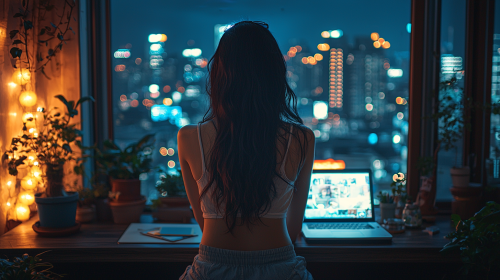 On a dark night, a laptop is placed on a desk with beautiful lighting in the room, and a beautiful long-haired Korean woman wearing glasses, a tank top and shorts is sitting in front of the desk, looking at the laptop and thinking., cinematic lighting, ultra detailed, extreme wide shot, Aerial View, back view, --stylize 750 --style raw --quality 2 --ar 16:9 --v 6.1