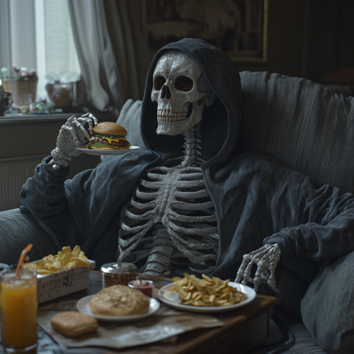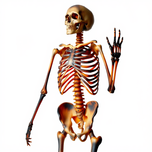 a high quality realistic image of a skeleton wearing a suit, jacket, shirt and tie and trousers. You can see the whole body of the skeleton, and he is standing at 45 degree angle with his hands clasped in front of his body